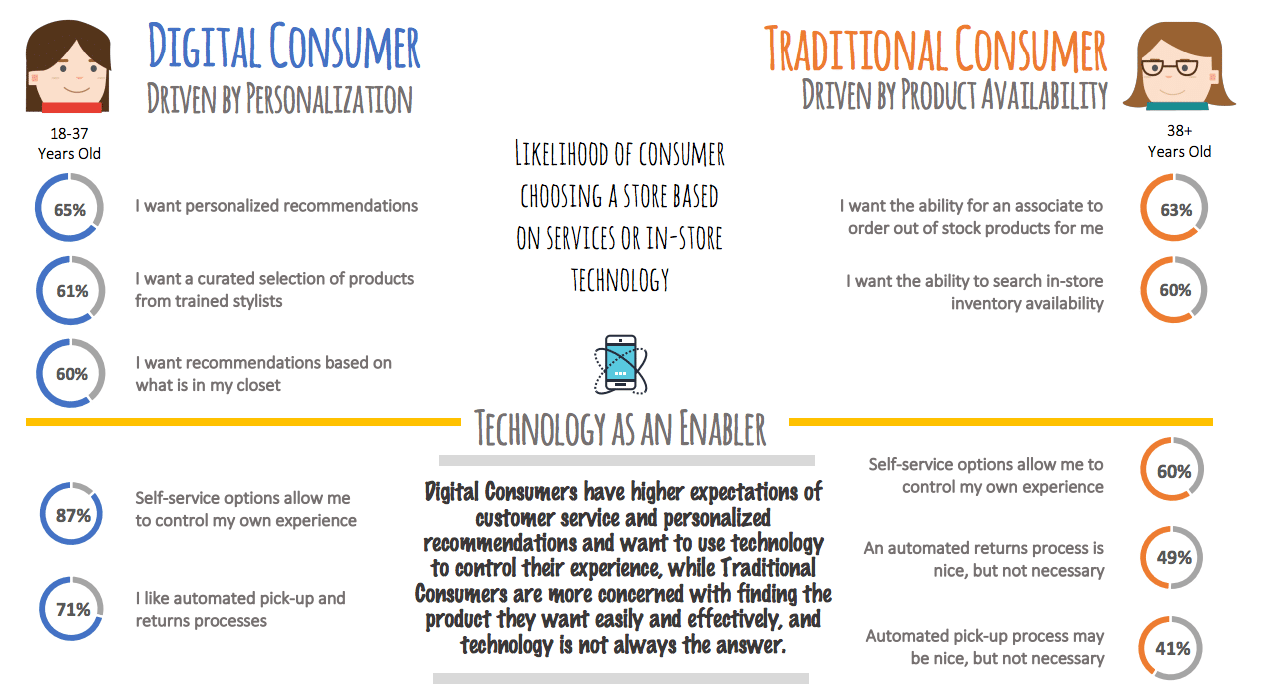 As Digital Consumers research products, they seek out consumer reviews to make more educated purchase decisions. When choosing a store, 65 percent want the ability to receive personalized recommendations and 65 percent prefer the ability to pay via a mobile wallet or retailer app. Receiving merchandise quickly is important with same day delivery a reason to choose a store for 77 percent of these consumers. Digital Consumers are more likely than Traditional to share feedback on social media for both exceptional and unsatisfactory shopping experiences.