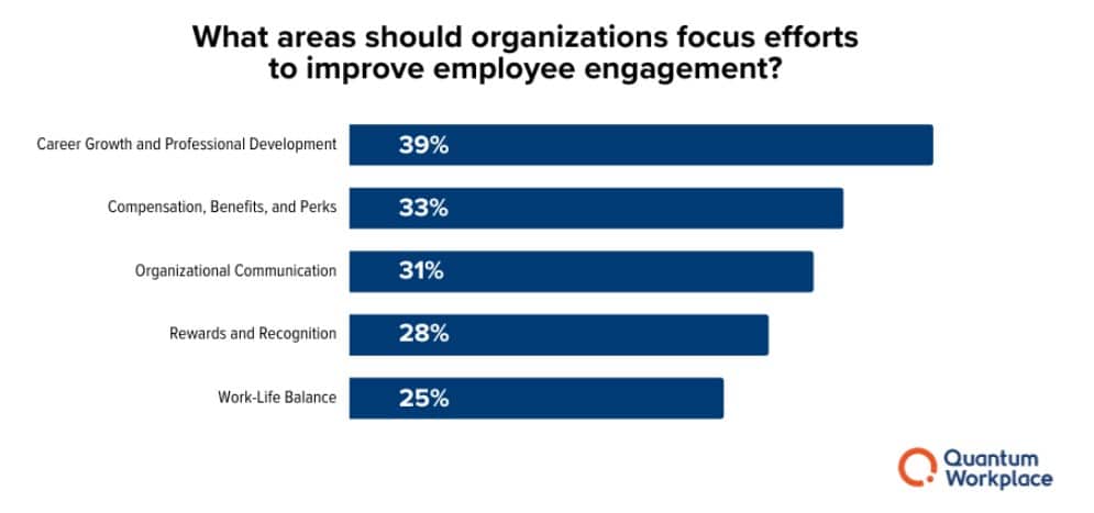 - Top actions employees want to see in response to surveys are in the topics of career growth, pay and benefits, and organizational communication.